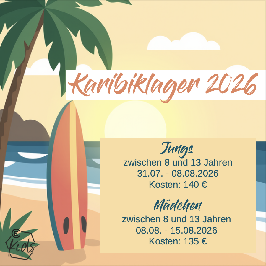 Mach dich bereit für Sonne, Sand, Palmen und spannende Abenteuer – du bist eingeladen, Teil unserer abenteuerlichen Reise in die traumhafte Karibik zu sein! Dich erwarten fröhliche Gemeinschaft, jede Menge Spaß und unvergessliche Tage voller karibischem Flair. Zusammen werden wir spannende Spiele erleben, Schätze auf tropischen Inseln suchen und uns in coole Abenteuer stürzen. In unserem Karibiklager schlafen wir in Zelten, singen abends gemeinsam am Lagerfeuer, entdecken die Natur und genießen das, was Gott geschaffen hat. Also: hisse die Segel, pack dein Abenteuerherz ein und komm mit auf unsere Reise durch die Karibik!